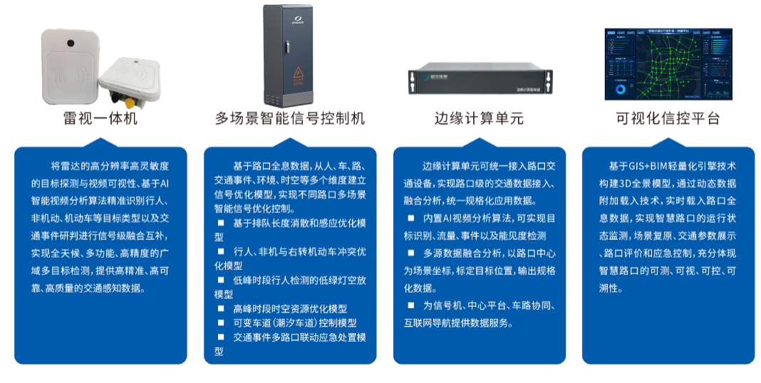 公司憑借十多年(nián)行業積累優勢,圍繞智慧路(lù)口的應用,以數據驅動爲根基,端邊路(lù)口爲切入點,探索路(lù)口的人(rén)、車、路(lù)、事(shì)件(jiàn)、環境的全息感知。公司自(zì)主研發内置AI算法的邊緣計(jì)算單元,接入雷達、視頻、雷視一體(tǐ)機(jī)等檢測設備,進行多源數據融合,打造路(lù)口全息數據孿生(shēng)底座。結合我司多場景化智能信号控制機(jī),協同虛拟與現實技術(shù)的可(kě)視化信控平台,實現路(lù)口的智能自(zì)适應控制、全息運行狀态監測、路(lù)口評價、交通參數展示、車路(lù)協同和交通管制等一體(tǐ)化智慧路(lù)口解決方案。