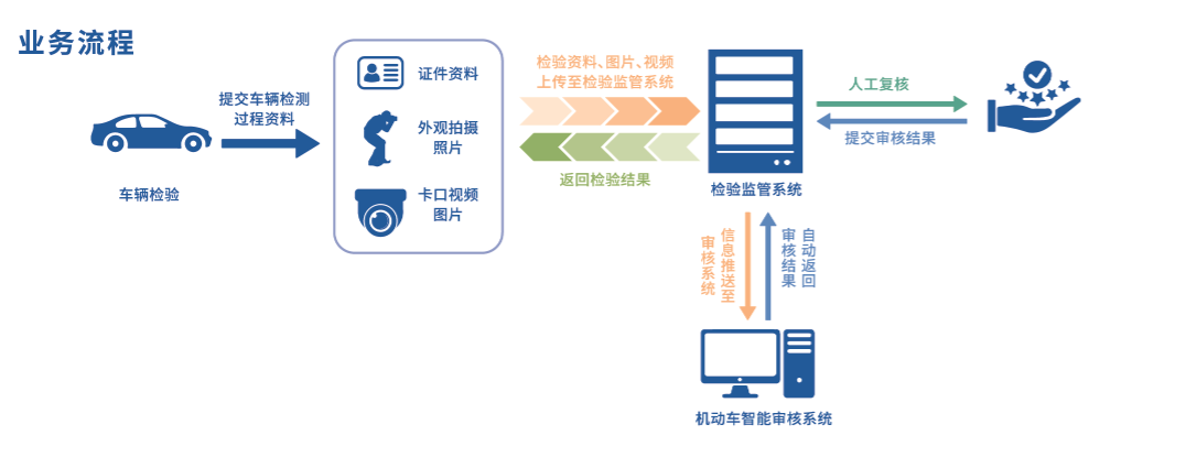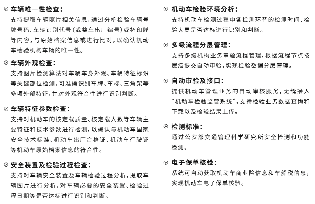 機(jī)動車安全技術(shù)檢驗業務智能審核系統是采用計(jì)算機(jī)深度學習算法提取圖片和視頻中特征信息,對車輛(liàng)檢驗過程的外觀照(zhào)片、檢測工(gōng)位照(zhào)片、證件(jiàn)單據圖像上的主要特征和技術(shù)參數進行提取,通過規則内容對圖片、文字進行解析、記錄、比對,實現車輛(liàng)特征查驗、車檢過程分(fēn)析、證件(jiàn)單據信息審核及異常數據預警功能,提供機(jī)動車管理(lǐ)業務的智能查驗審核服務。