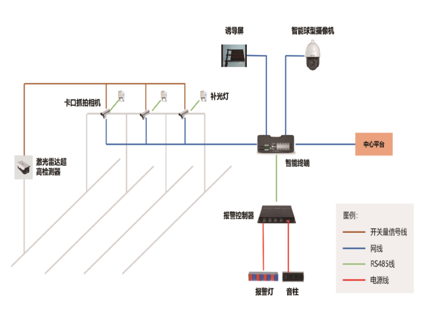 系統支持對過往車輛(liàng)進行實時監測;支持對超高車輛(liàng)車牌識别、視頻錄像、圖像抓拍(pāi)、異常駕駛行爲檢測、判别和輸出;支持信号燈、誘導屏、紅(hóng)藍閃光(guāng)燈和定向音柱等聯動預警。