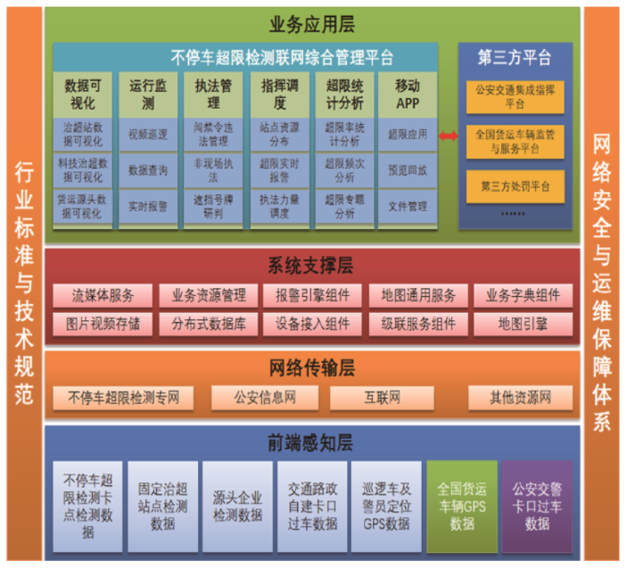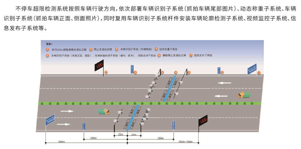 不停車超限檢測系統支持貨運車輛(liàng)車型、軸數、軸重、車貨總質量動态檢測和輸出,支持貨運車輛(liàng)輪廓尺寸(長、寬高)動态檢測和輸出功能,支持貨運車輛(liàng)車牌識别、視頻錄像、圖像抓拍(pāi)、異常駕駛行爲檢測、判别和輸出,支持貨運車輛(liàng)超限信息和輪廓尺寸告知、發布和顯示功能。