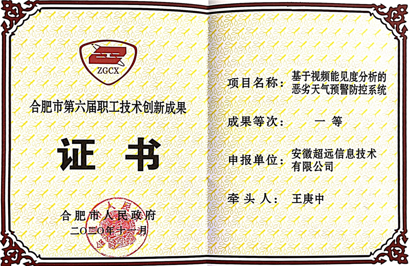 日(rì)前,由合肥市總工(gōng)會主辦的第六屆合肥市職工(gōng)技術(shù)創新成果獎評選活動落下帷幕。安徽夜蒲信息技術有限公司高級工(gōng)程師(shī)王庚中及團隊研發的技術(shù)創新成果《基于視頻能見(jiàn)度分(fēn)析的惡劣天氣預警防控系統》在合肥市職工(gōng)技術(shù)創新成果獎評選中首次獲得(de)一等獎稱号!