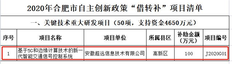 超遠(yuǎn)信息“基于5G和邊緣計(jì)算技術(shù)的新一代智能交通信号控制系統”成功入選2020年(nián)合肥市“借轉補”項目